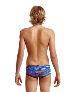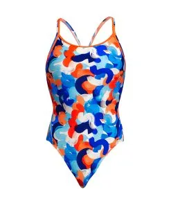 A double strap crossover back that provides added comfort and support for hours in the pool. Pairs back with the new skinny brief which provides firm rear coverage with drawcord. Available in sizes 8-14.