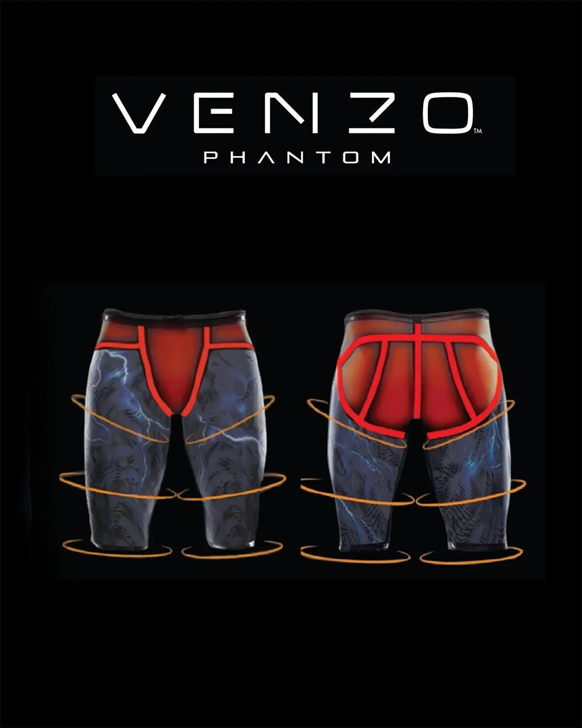 In addition, a patent pending taping and inner textile design known as the suit’s Endo Mid Compression Cage™ provides a shield of support for the glutes, while no taping on the quads yields a less compressive fit on the legs. This cage not only creates a snapback effect in the water but also helps to increase distance per stroke. Working in tandem with this technology is the Venzo’s Seamless Exo Shell™, a sleek construction geared toward streamlining body position.