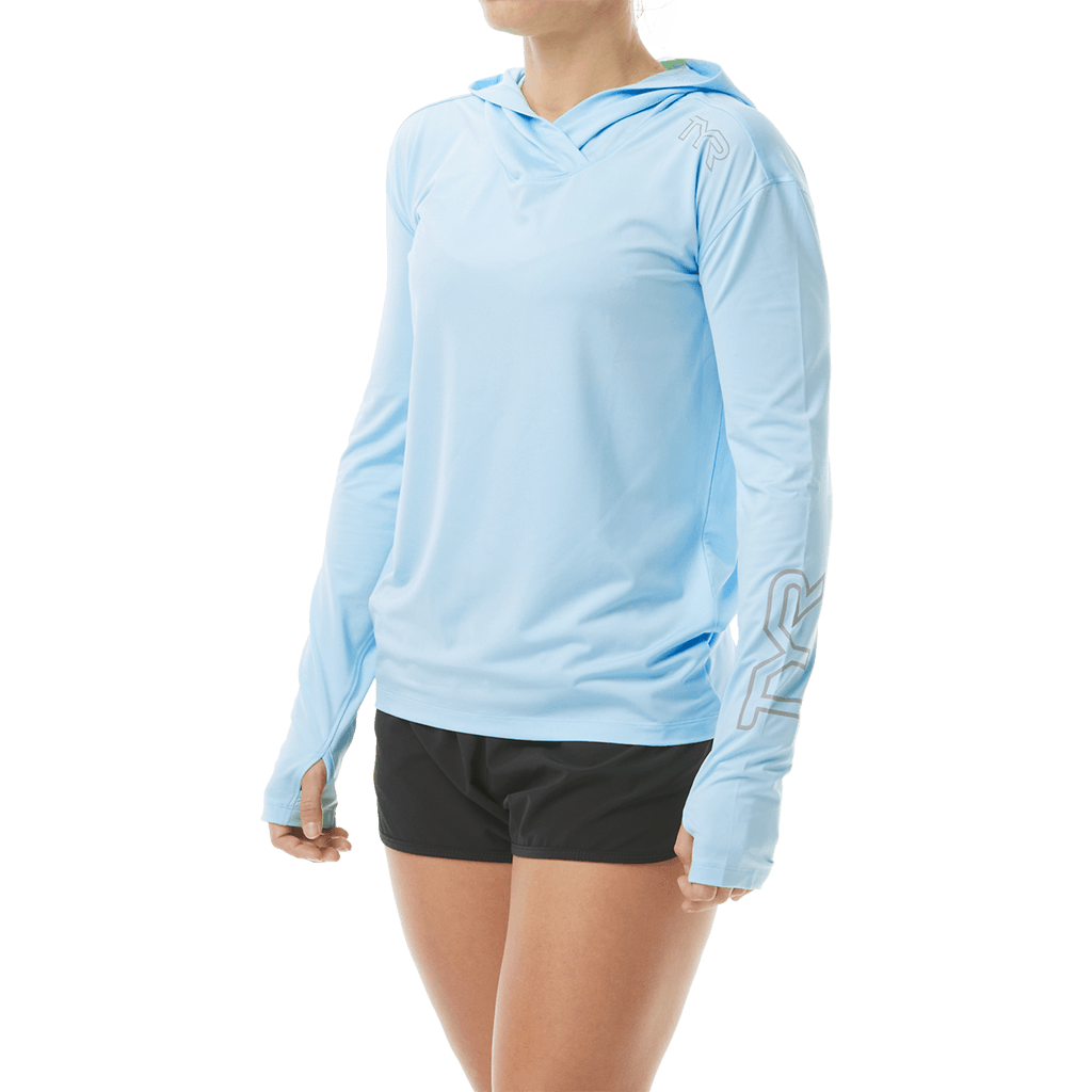 Gear up in the TYR Women’s SunDefense Hooded Shirt. The TYR SunDefense collection has the most effective UV protectant coverage for outdoor adventurists. With UPF 50+ to block UVA and UVB rays for hard-core sun protection, in addition to SunDefense QuickDry, moisture-wick fabrication and superior breathability, the SunDefense apparel is a must-have for any athlete’s arsenal.